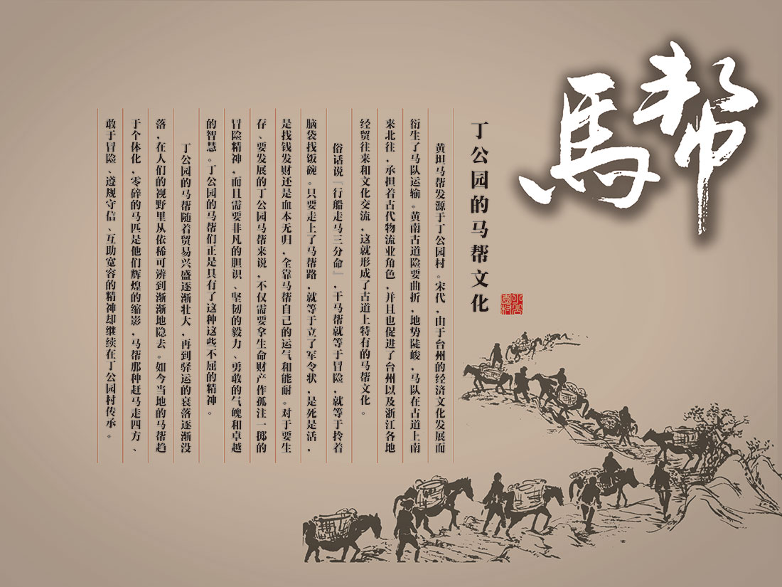黄坦马帮发源于丁公园村。宋代,由于台州的经济文化发展而衍生了马队运输。黄南古道险要曲折,地势陡峻,马队在古道上南来北往,承担着古代物流业角色,并且也促进了台州以及浙江各地经贸往来和文化交流,这就形成了古道上特有的马帮文化。