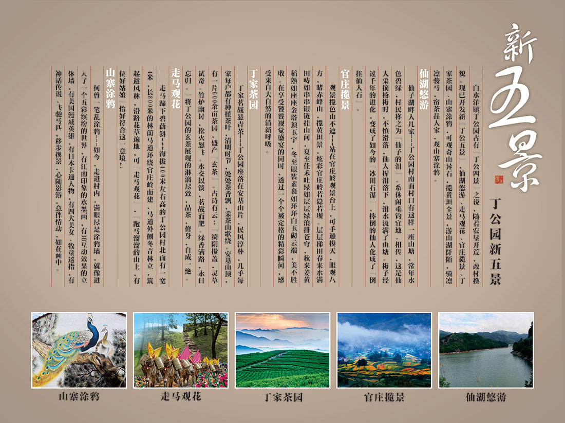 白水洋镇丁公园古有“丁公四景”之说,随着农垦开荒,改村换貌。现已开发新“丁公五景”,仙湖悠游、走马观花、官庄揽景、丁家茶园、山寨涂鸦,可观奇山异石,揽黄坦全景,游山湖阡陌,骑凛凛骏马,宿茶品人家,观山寨涂鸦。