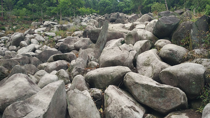临海丁公园村冰川石浪第四纪冰川遗址,覆卮山半山腰上,三条由重重叠叠、浩浩荡荡的巨大鹅卵石汇成的石河呈“川”字形排列,巨石滚滚,顺坡而下,气势壮观。手脚并用攀爬在大石浪上面,绝对是不可多得的体验!!