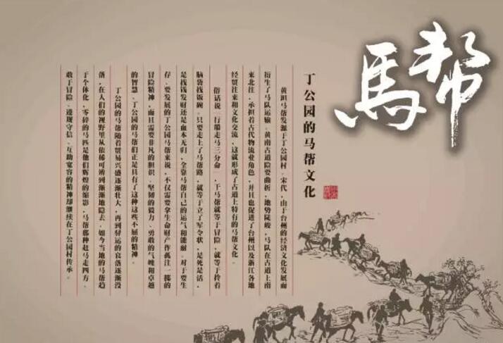 黄坦马帮发源于丁公园村。宋代,由于台州的经济文化发展而衍生了马队运输。黄南古道险要曲折,地势陡峻,马队在古道上南来北往,承担着古代物流业角色,并且也促进了台州以及浙江各地经贸往来和文化交流,这就形成了古道上特有的马帮文化。