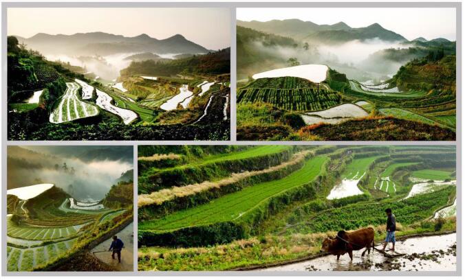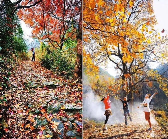 “梯田层层映红枫,溪水潺潺照古桥”描绘的是黄南古道独特的风景。临海段的古道以万亩梯田最为特色。梯田从山脚至山顶,像一条条彩带绕山而行,大的像球场,小的像水缸,重重叠叠,高达上百层;像一架架天梯伸向空中,蔚为壮观。登上顶峰,俯瞰梯田,只见重重叠叠,荡漾着光与影,恍若梦幻般神秘。